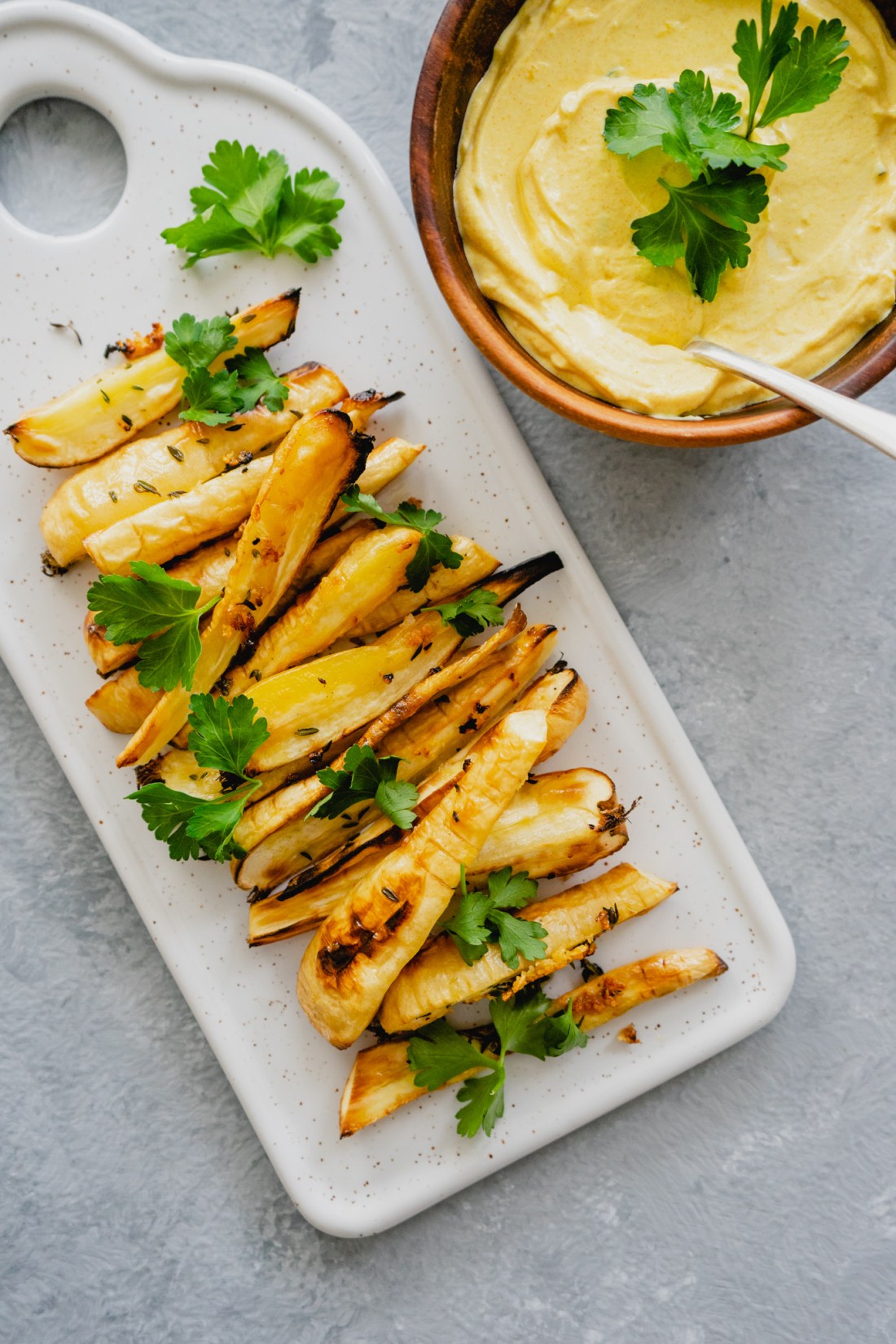 Enquanto a cherovia estiver no forno, preparar o molho, misturando numa taça todos os ingredientes – queijo quark, alho, sumo limão, cúrcuma, tomilho, azeite e sal até estar cremoso.